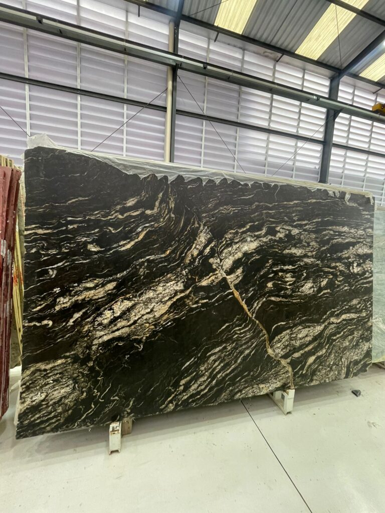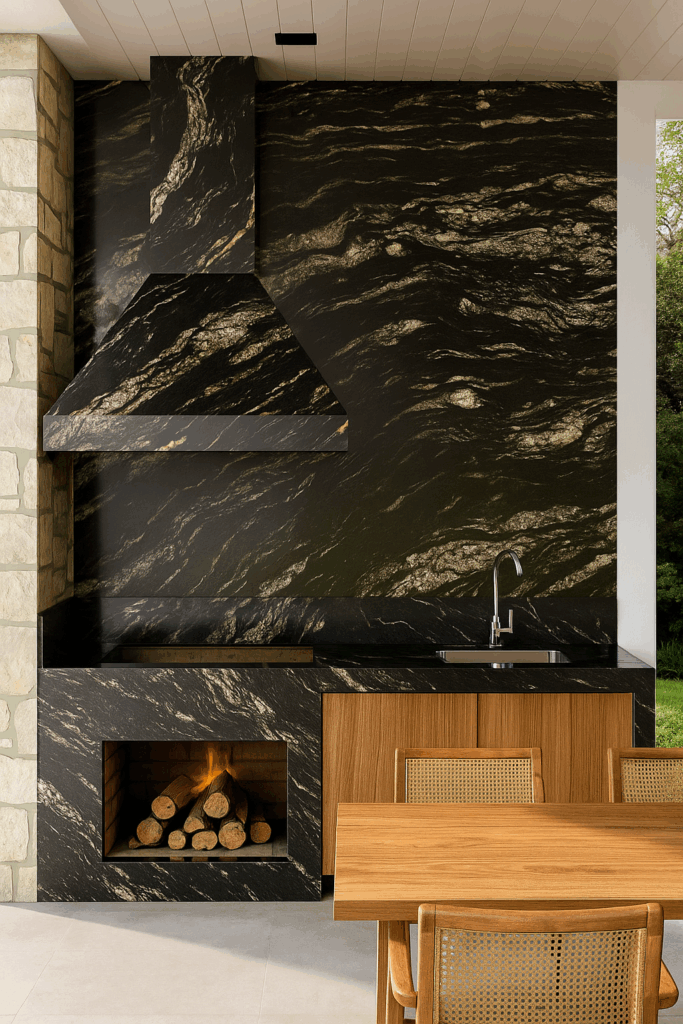um quartzito exclusivo, de tons escuros e veios marcantes, trazendo sofisticação e personalidade ao ambiente.