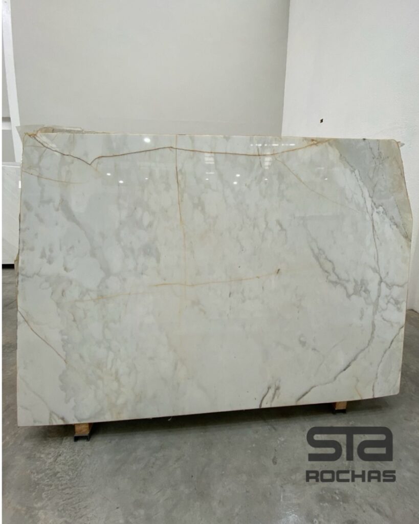 Com origem nobre e composição calcária refinada, este mármore italiano combina veios intensos em tons dourados e acobreados sobre um fundo branco translúcido.