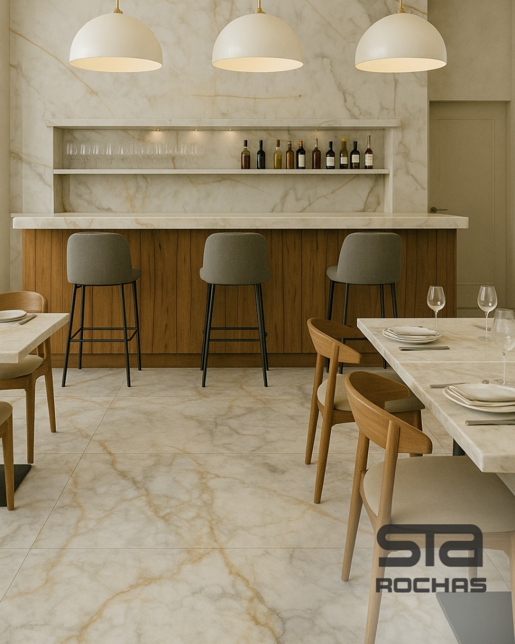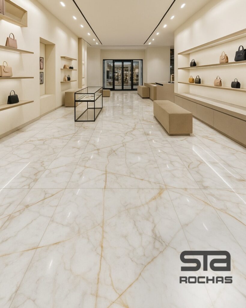 Altamente valorizado em projetos de alto padrão, o Macchia Oro alia performance estética com grande potencial de aplicação em pisos, painéis e bancadas.