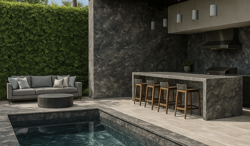 Este quartzito exclusivo traz um visual marcante com tons intensos e textura elegante, perfeito para áreas externas de alto padrão. Ideal para quem busca luxo, resistência e personalidade em projetos como piscinas e espaços gourmet. Transforme o seu ambiente com a beleza natural dessa pedra única! #Quartzito#DesignExclusivo#ÁreaGourmet#PiscinaLuxuosa#ArquiteturaDeLuxo